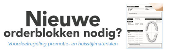 Leden van de Branchevereniging Tandtechniek kunnen gebruik maken van de voordeelregeling promotie- en huisstijlmaterialen. Voor uw orderblok kan uitgegaan worden van uw huidige ontwerp, maar een geheel nieuw ontwerp is ook mogelijk. Direct een offerte voor het laten maken van orderblokken aanvragen? Dat kan via dit contactformulier.